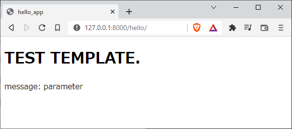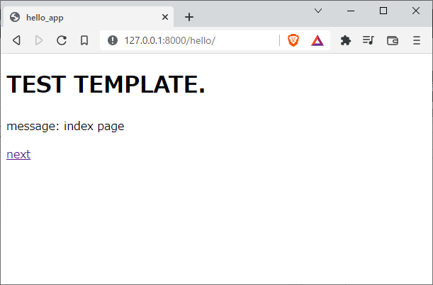 <!DOCTYPE html> <html lang="ja"> <head> <meta charset="utf-8"> <title>hello_app</title> </head> <body> <h1>TEST TEMPLATE.</h1> <p>message: {{msg}}</p> <p><a href="{% url goto%}">{{goto}}</a></p> </body> </html>